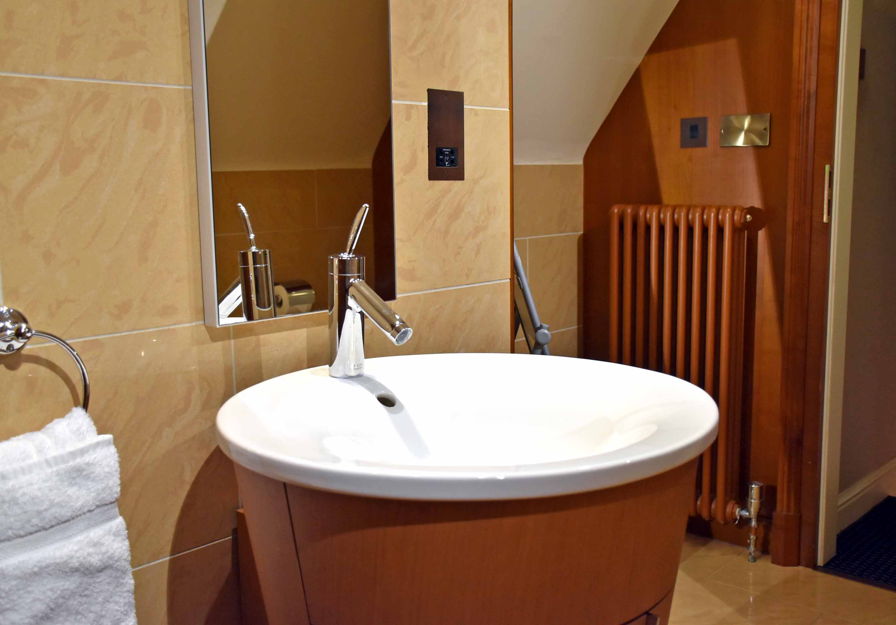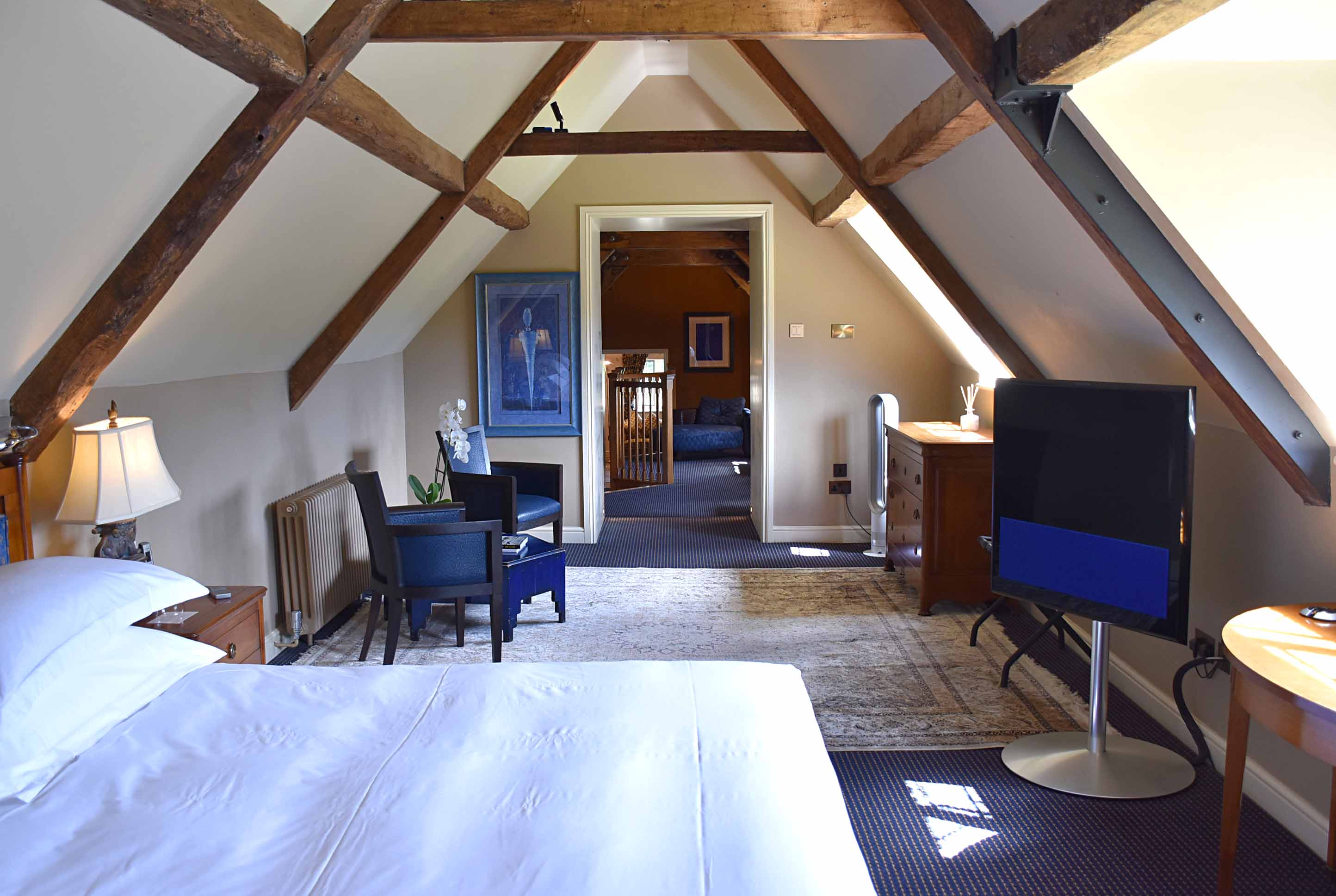 We were staying in room 24 – The Grand Suite. This gargantuan suite spans the second floor of the main house and is south-facing with some lovely views out over the Wiltshire countryside. As you enter the room you’ll find a lounge area with a concealed TV in the cupboard. Follow through to the landing and climb a couple of stairs you’ll discover a second seating area with writing desk and behind a small chaise lounge.