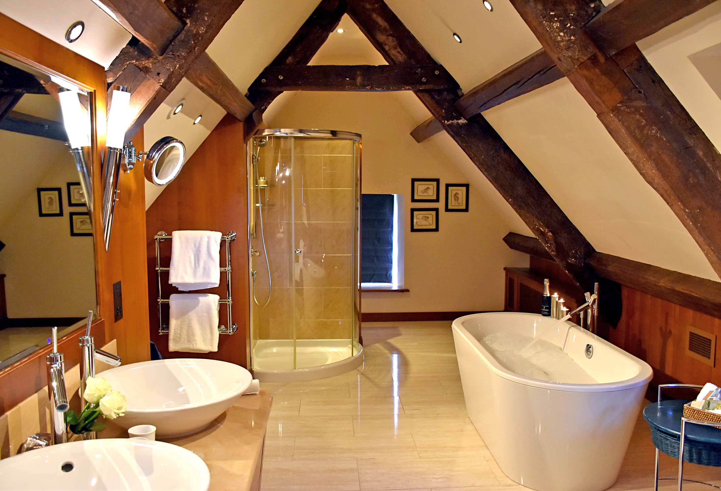 The exposed wooden beams really add feature and comfort to the room and is complimented by some beautiful furnishings and fabrics which create a sense of luxury. A large bed, more chairs and a TV which we never managed to switch on – always a good sign in my opinion. My trusty Ted Baker holdall made the journey with us too.