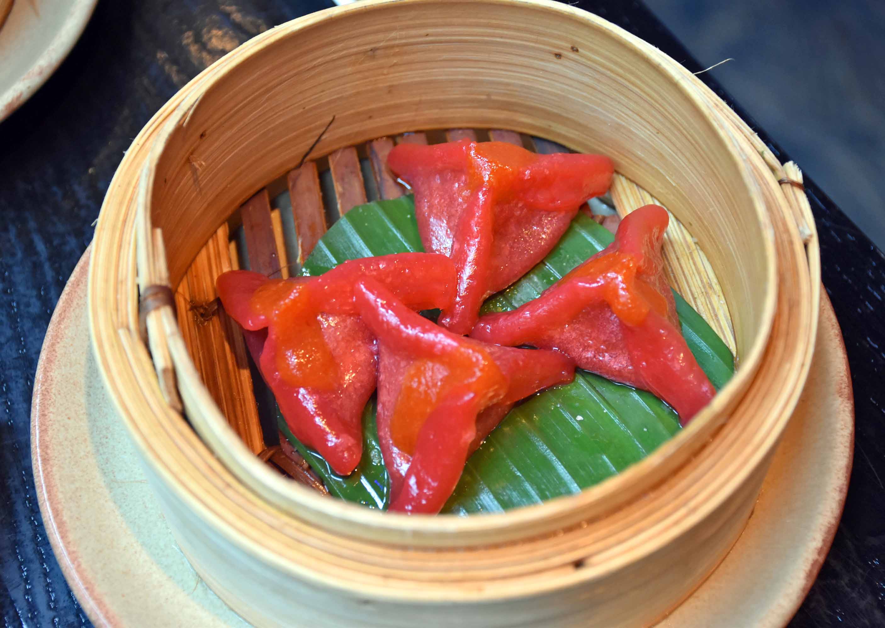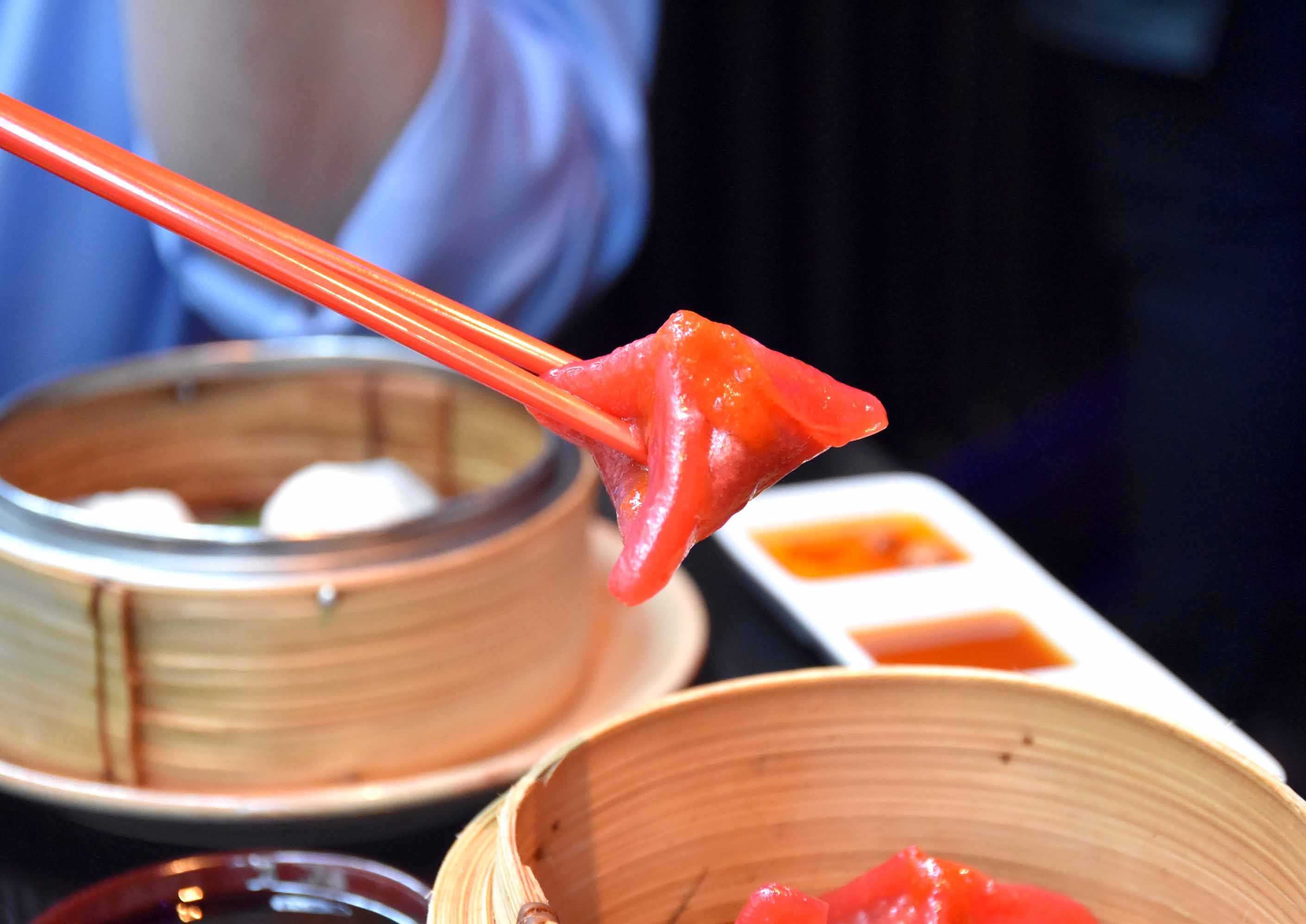 Price wise Tattu isn’t your cheapest restaurant in town, but neither is it the most expensive and their dim sum lunch menu is rather competitive. Four courses of dim sum each will set you back around £22 and you’ll leave feeling very full. First out was a plate of excellent crispy duck spring rolls with plum sauce for dipping and some lovely vibrant red wagyu dumplings. Pastry was a little on the thick side of our dim sum, but the flavour was superb.