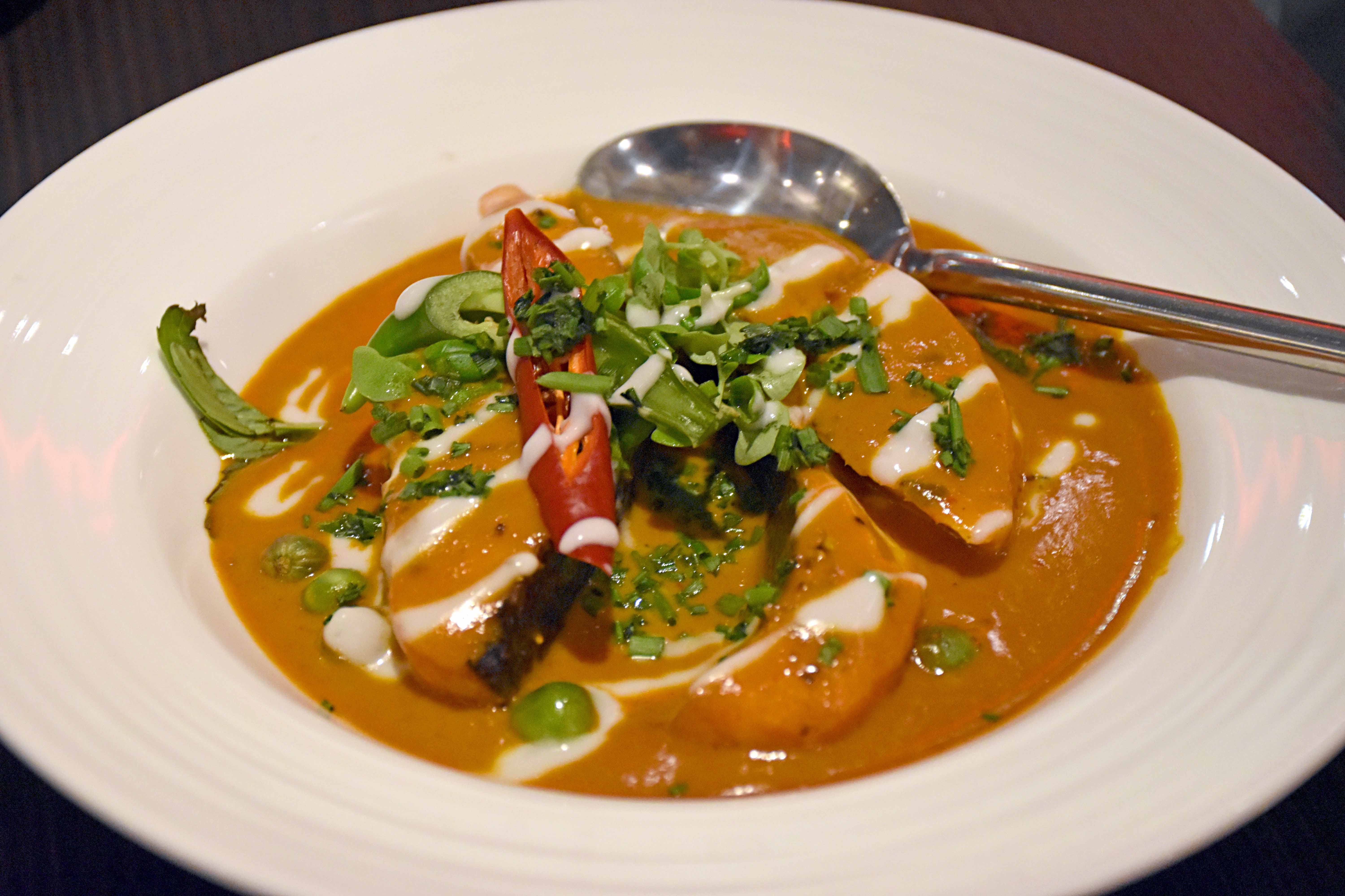 I also loved the stir-fried prawns with garlic, black pepper and Brussels sprouts. The latter ingredient may sound rather peculiar, but if you love Brussels sprouts just as much as I do you’ll love this dish. Again the prawns were very well cooked, the flavours were subtle and once devoured with a spoonful of fluffy rice we were very satisfied. The rich and creamy red curry with salmon fillet, coconut milk and selection of Thai herbs was another lovely dish packed with flavour. I wasn’t quite sure about the added addition of peas, but I still really enjoyed it none the less.
