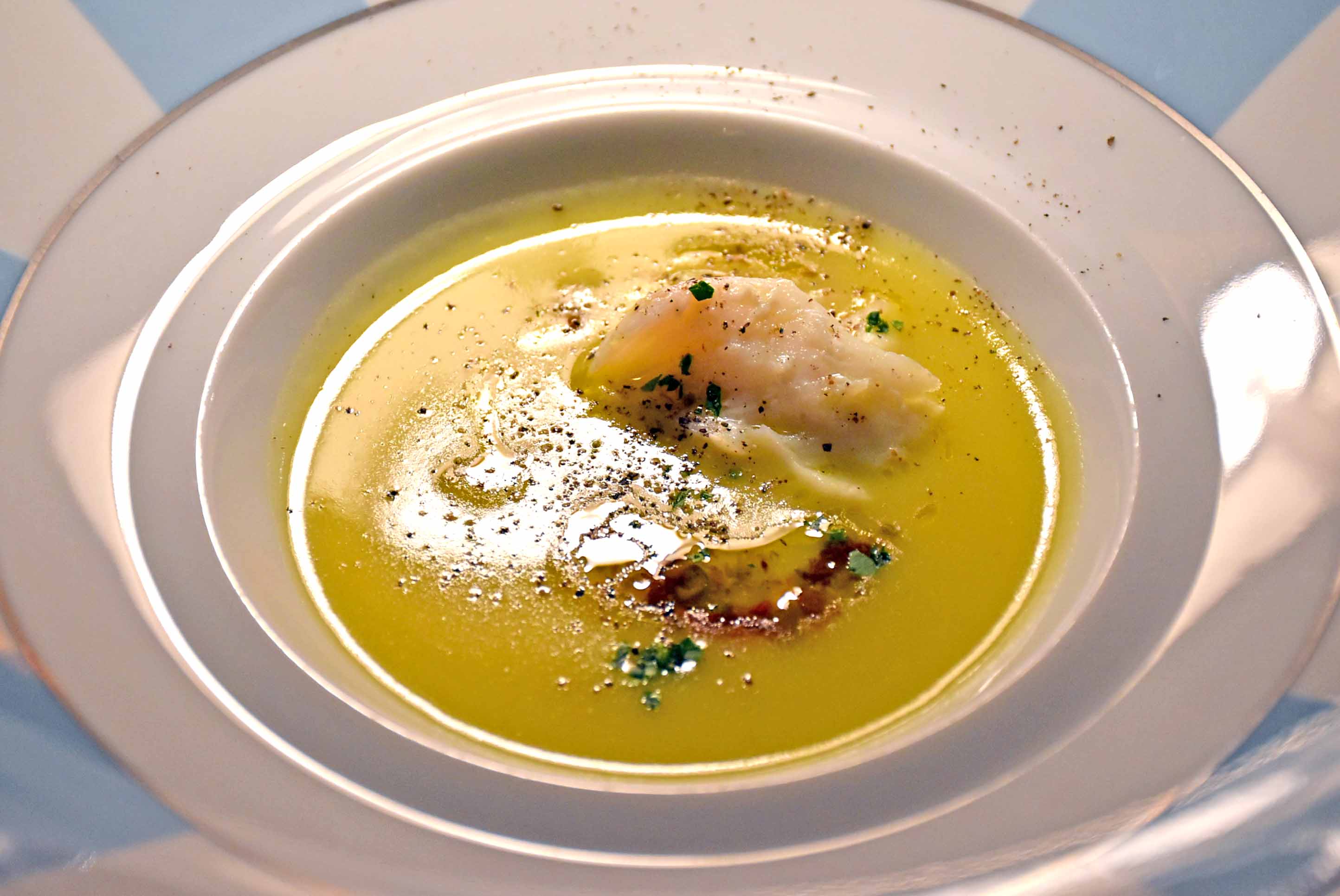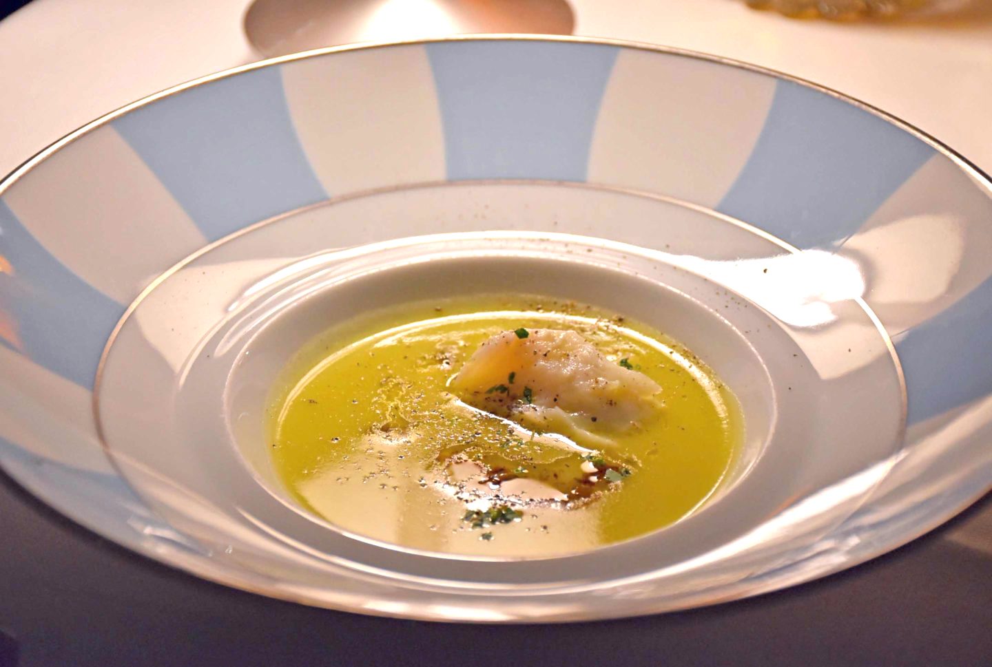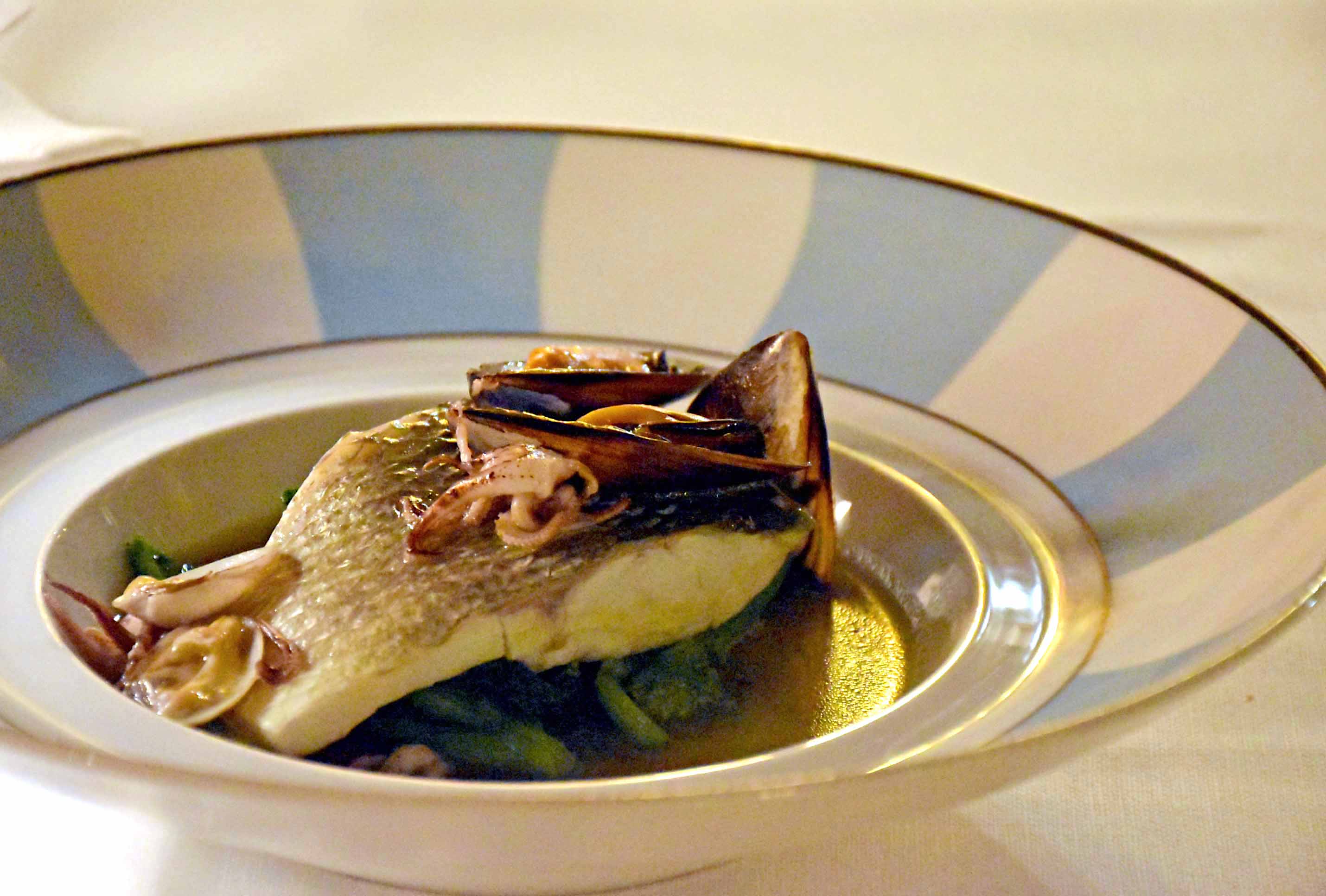 The executive chef here at Club del Doge is Daniele Turco and he loves to use this stunning backdrop to showcase Venice’s culinary delights. Our journey here started with an amuse bouche of white fish in a rich and buttery sauce which paired perfectly with the last of our Venetian Spritz. So much fragrance leaping out of the bowl, while a faint aroma of orange peel spread across our table from the spritz.