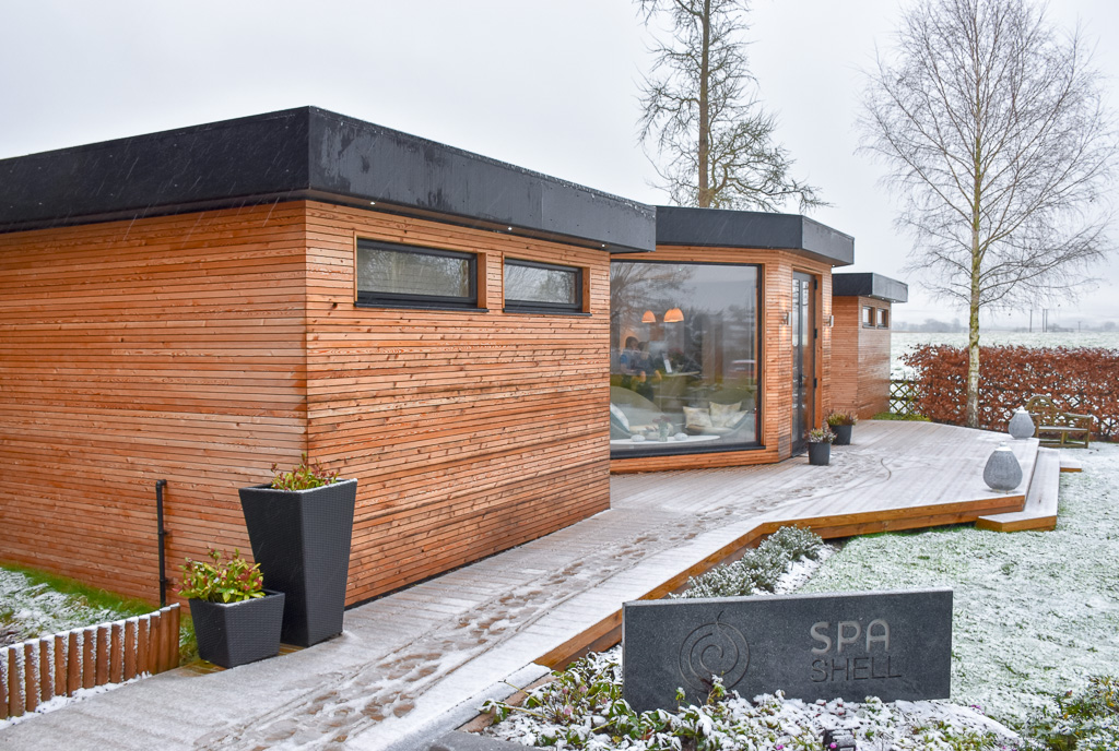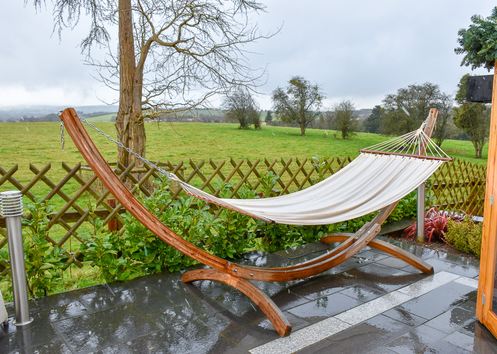 As well as the outdoor cedar wellness hot tub, there’s an oversized hammock on the decking, wooden heated snug room full of blankets and some sun loungers dotted around the patio. An even lovelier space in the Summer I’d imagine.