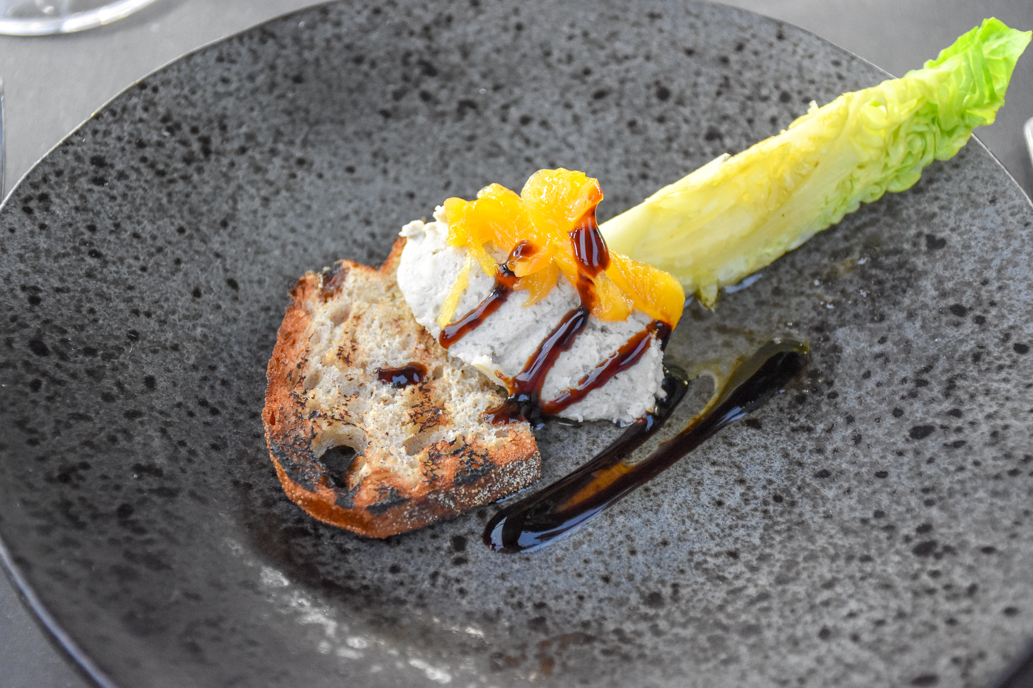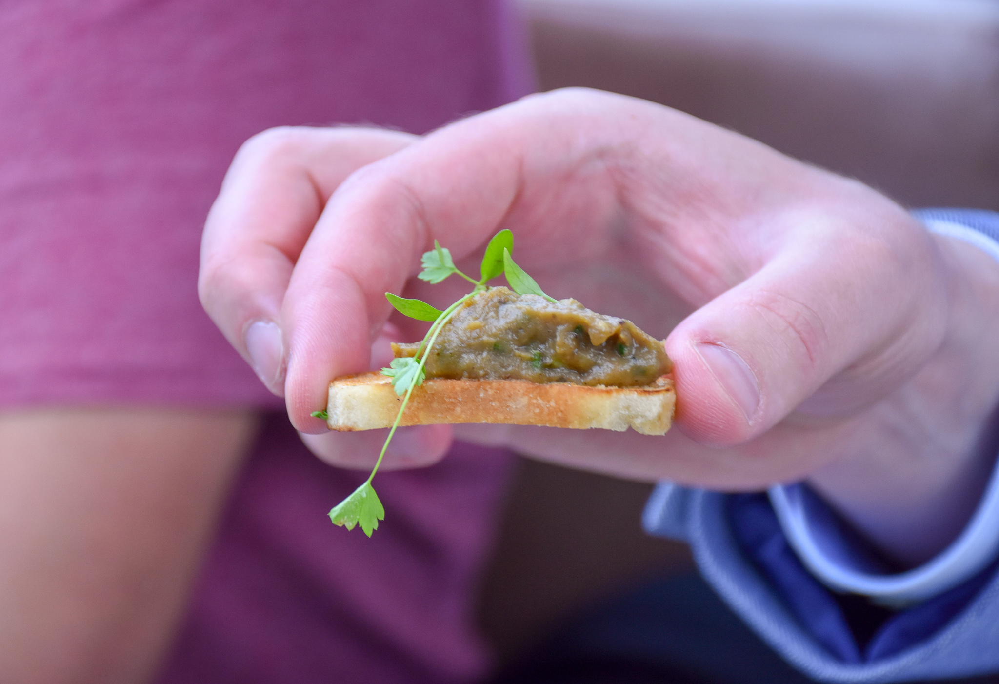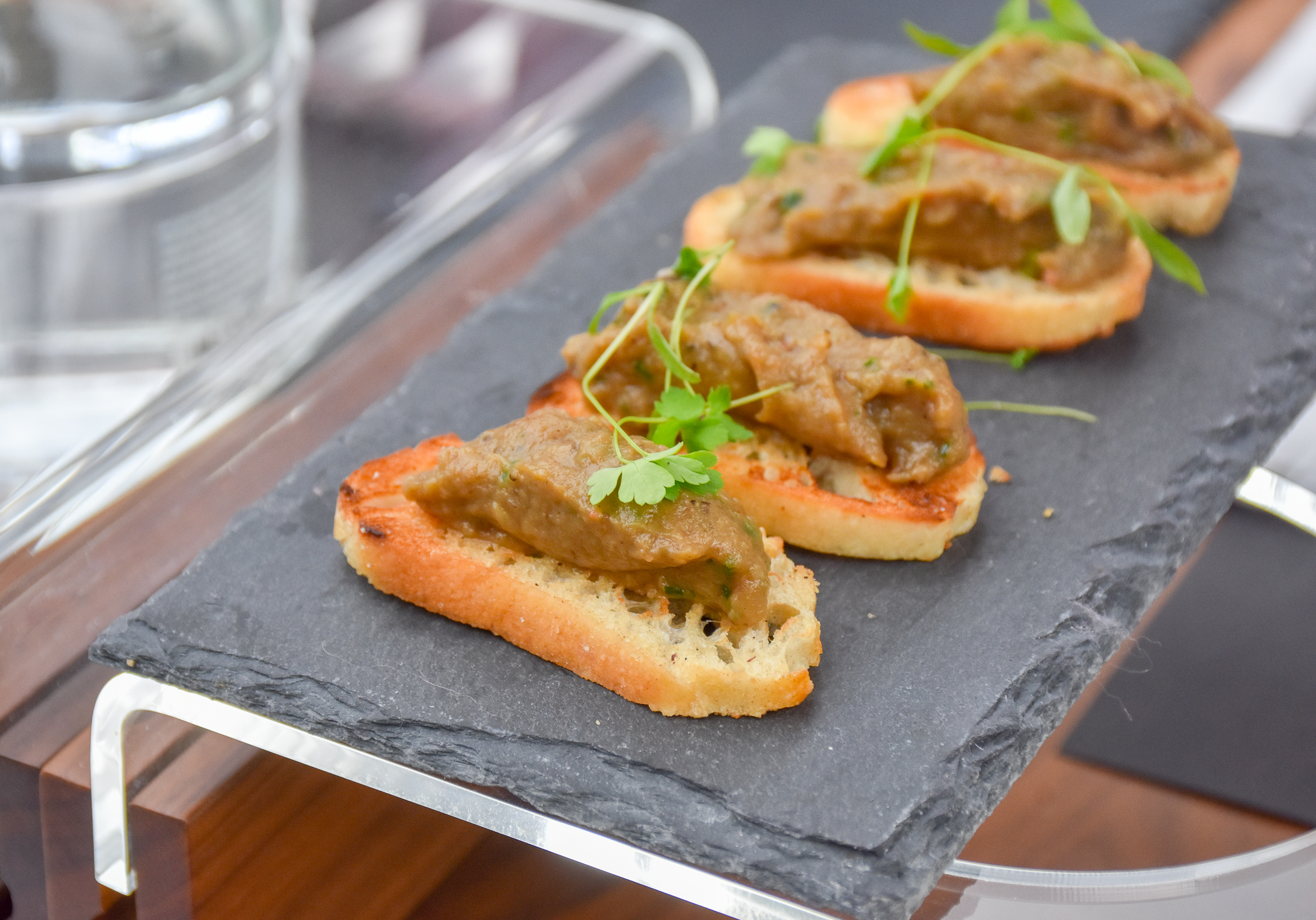 Shortly later some canapés arrived and they were the perfect way to start. Delicious bites of aubergine caviar on crisp bruschetta slices.