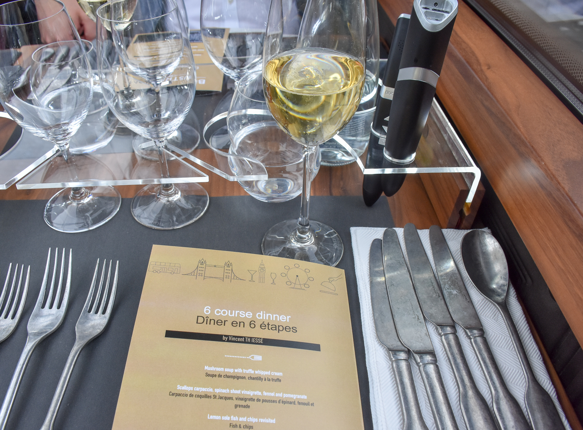 As we took off the waiters explained to us what would happen and how it would work, offering either a four-course lunch or six course dinner tasting menu, both coming with some fantastic wine pairings and bottled water whilst enjoying those views from the glass roof above our heads. Each diner is presented with a map of London and an electronic pen. Simply dab the pen on a landmark from your map and place to your ear, this little thing will then tell you the complete history of the landmark you’re passing. It’s rather clever!