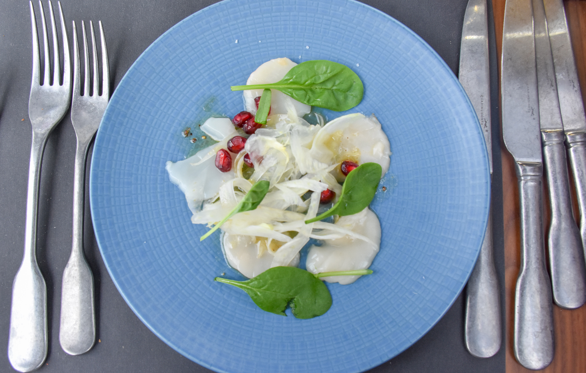 Next out, alongside our delicious Sauvignon Blanc this time was a scallops carpaccio with spinach shoot vinaigrette, fennel and pomegranate salad. The scallops were so fresh, very soft and cut through like butter. While the punchy vinaigrette sauce added even more freshness to the dish. The perfect Summer plate of food.
