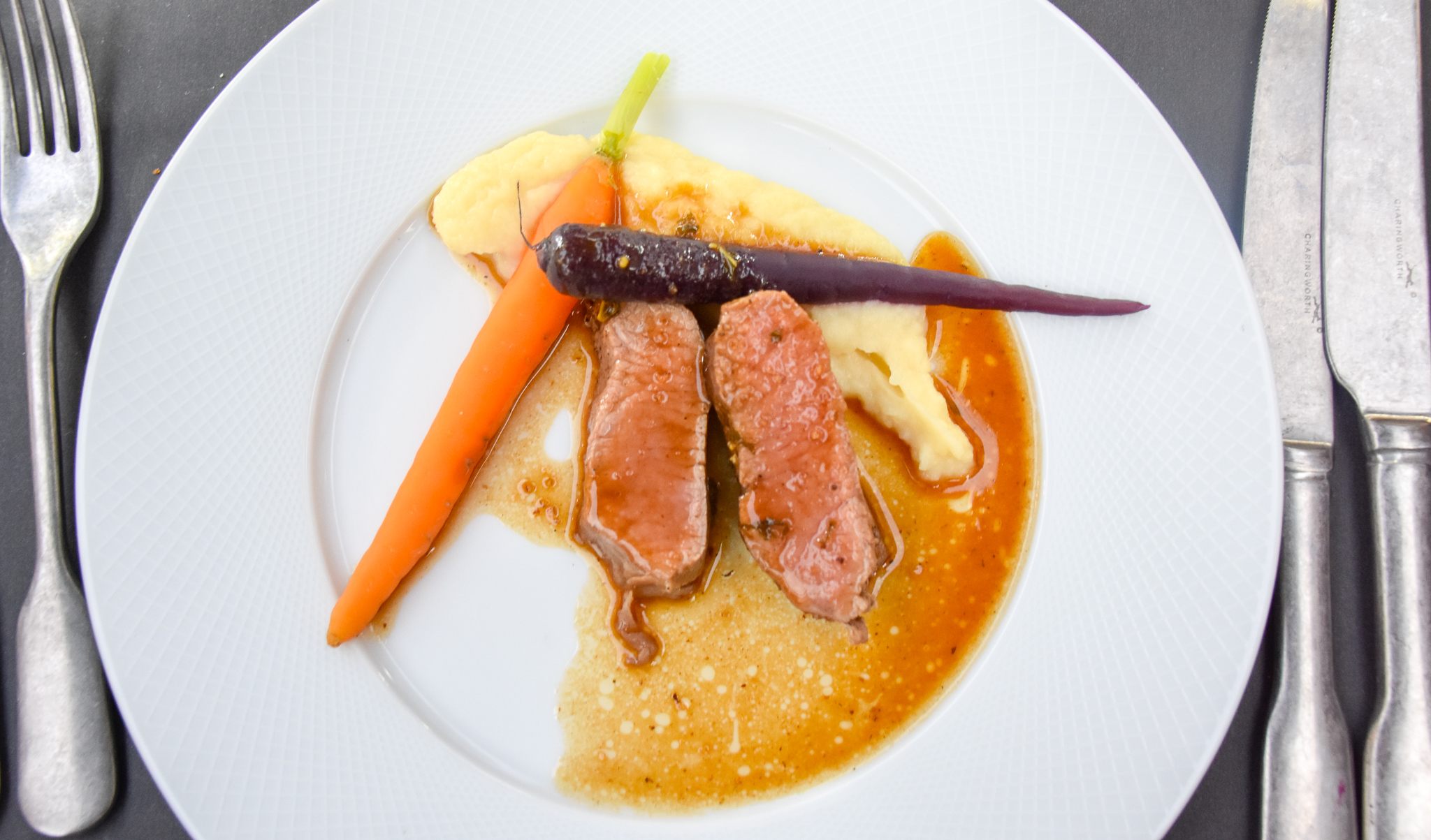 While I did absolutely love that mushroom soup, I think the meat course really stole the show and we fell completely in love with it. Perfectly cooked roast lamb fillet with a mint jus, buttery parsnip purée and beurre noisette. Textures, flavours and precision of cooking – this dish had it all and as the sun started to set, the bus illuminated inside and made everything just a little more magical.