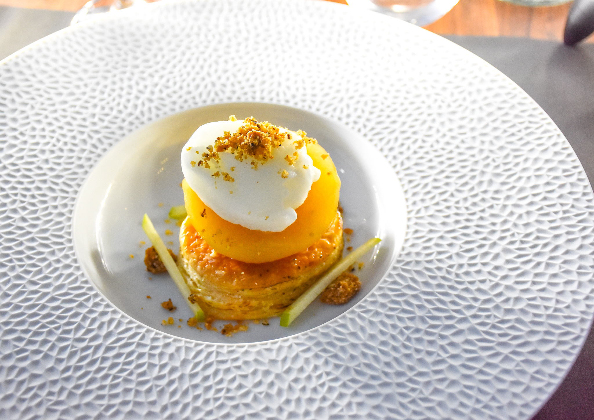 Close to finishing our gastronomic journey, dessert arrived and it was a fantastic end to one great eye-opening evening. Apple confit, hazelnut crumble and Granny Smith sorbet. Essentially a deconstructed tarte tatin. I loved it and my partner was evening hoping for extras of mine – though of course I cleared my plate clean.