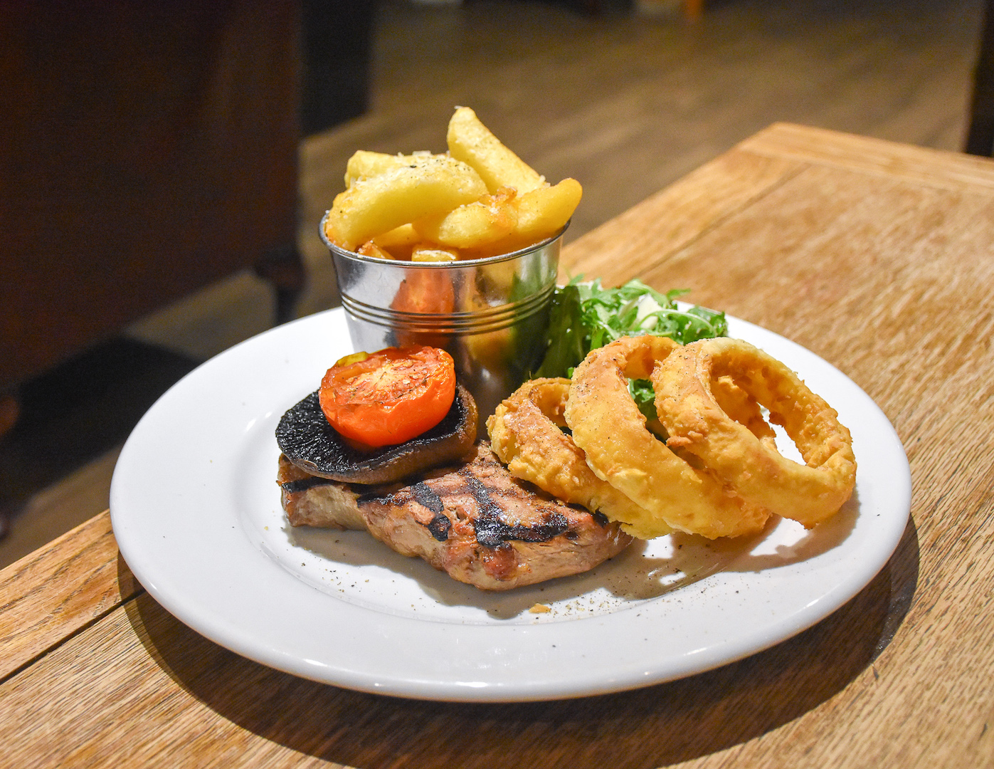 The 8oz sirloin steak, sourced from Welsh beef was beautiful and while perhaps cooked a little over my medium-rare specification, it was of good enough quality to not become tough and was full of flavour. The parmesan & white truffle fat cut chips were addictive, but the batter on the onion rings needed work. For steak fans, you’ll be very well fed.