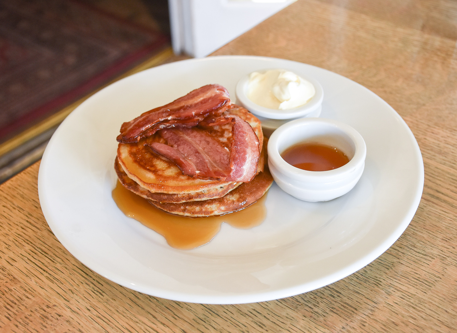 Breakfast the next morning was absolutely beautiful and so was the setting. Set towards the back of the main room is another dining room set up with a continental breakfast offering and a stunning conservatory room where the light pours into. I ordered the thick and fluffy pancakes with grilled bacon, maple syrup and sour cream. The perfect way to start our morning.