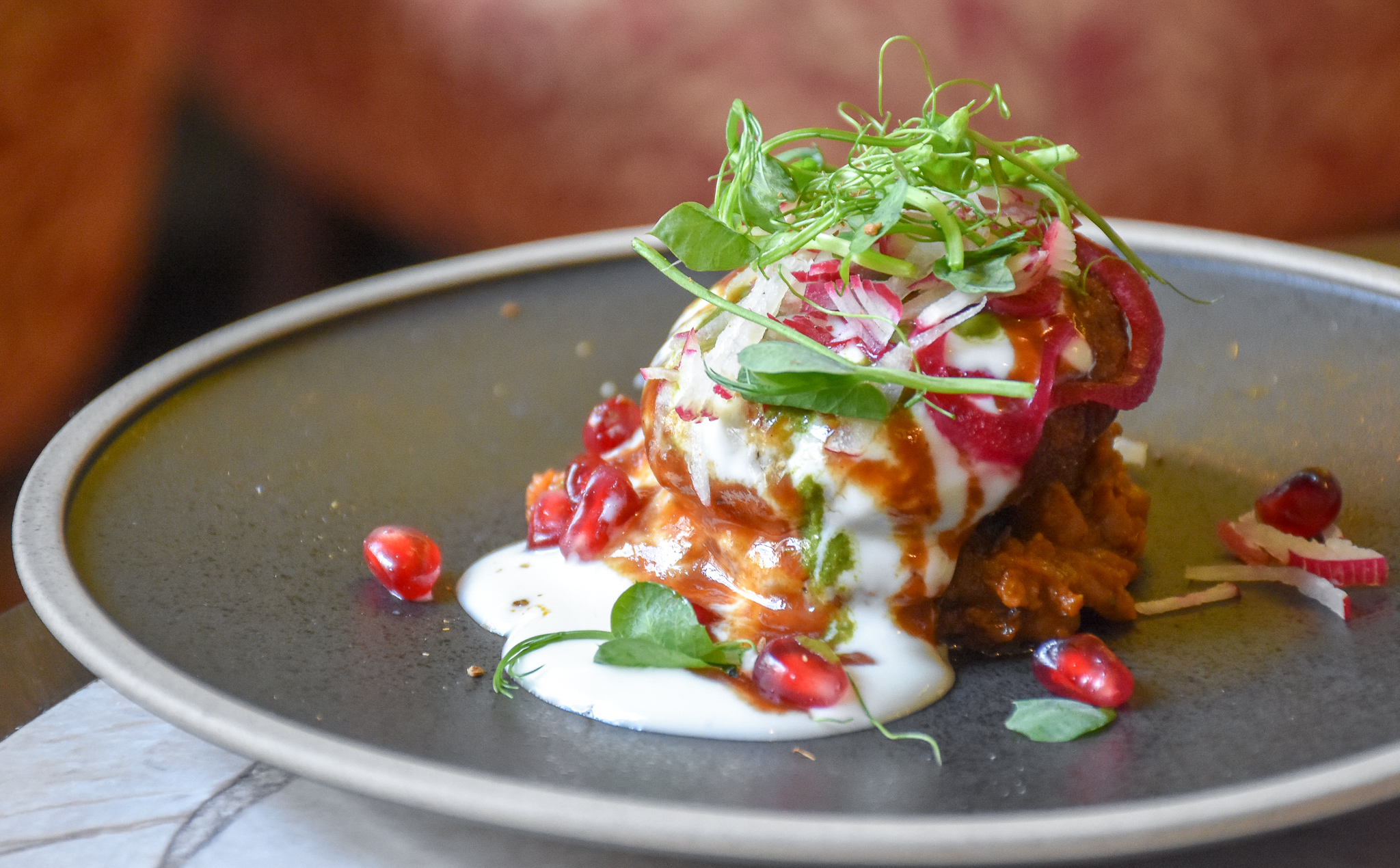 Better still and much to my surprise was the dhokla. It’s the one Indian food I’ve never really fallen in love with, but that’s all changed. Dhokla, if you don’t know is a steamed savoury cake from India, usually served for breakfast or as a snack. Here it’s the best version I’ve ever tried, served with dollops of chutney, poached apples and beetroot.