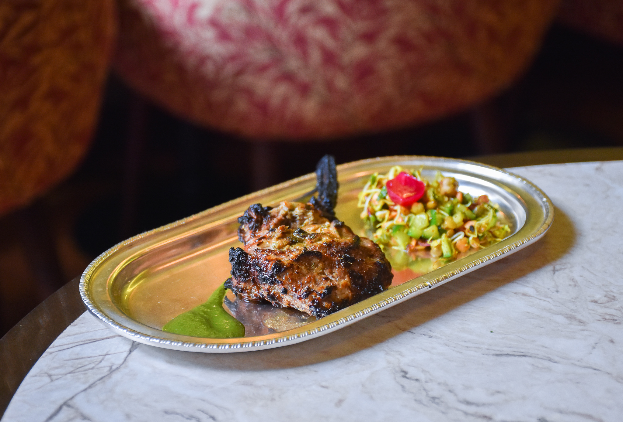 Inside it’s just as stunning, with the restaurants decor taking inspiration from its name, Kutir – which means ‘a small cottage in the middle of nowhere’. Florals, foliage, mint greens and rich reds with copper accents. It’s beautiful, calming and a fantastic backdrop for the menu which is looked after by Michelin-starred chef Rohit Ghai, whilst Abhishake Sangwan (both previously Jamavar and Gymkhana) is looking after front of house and cocktails.