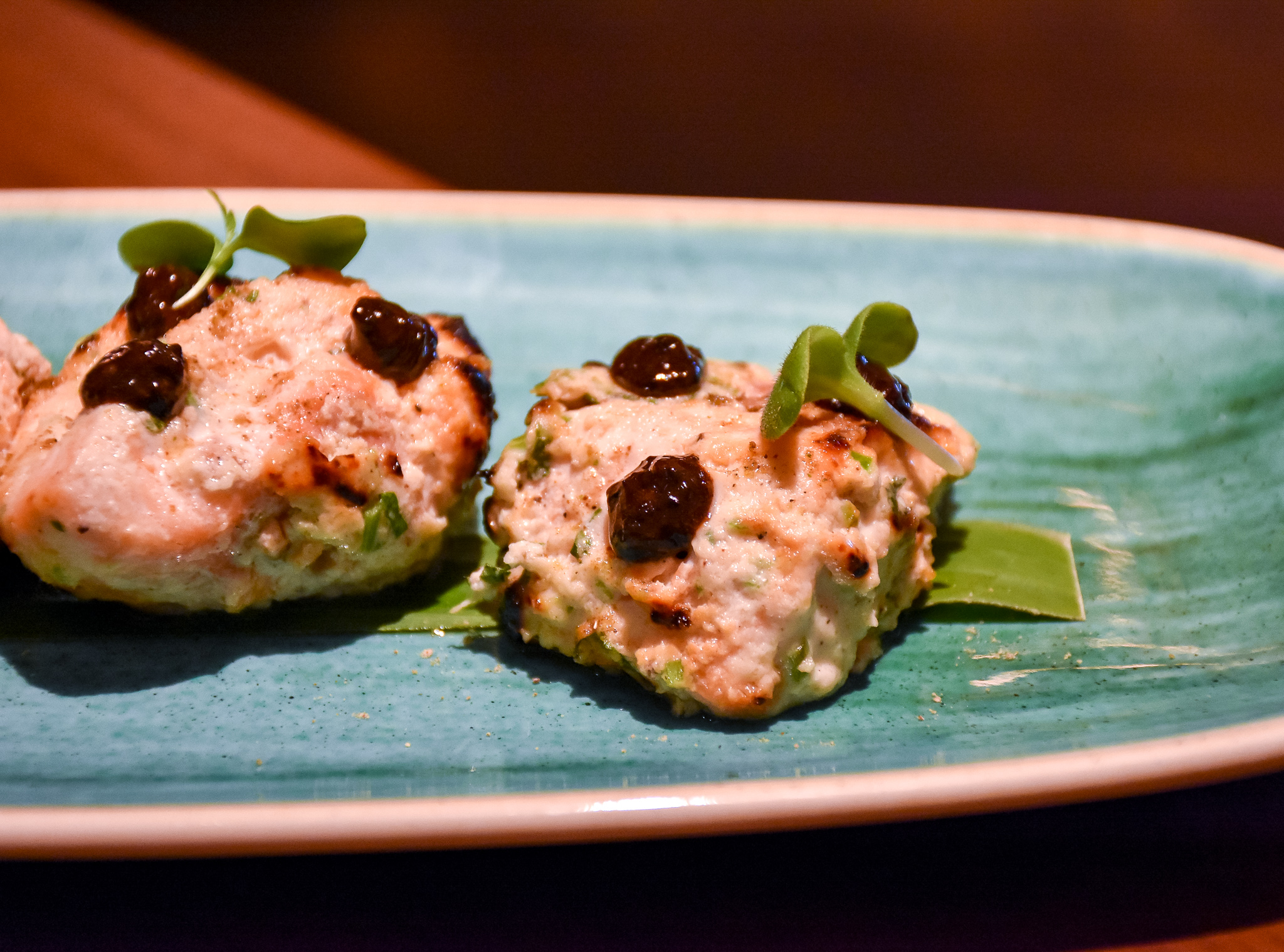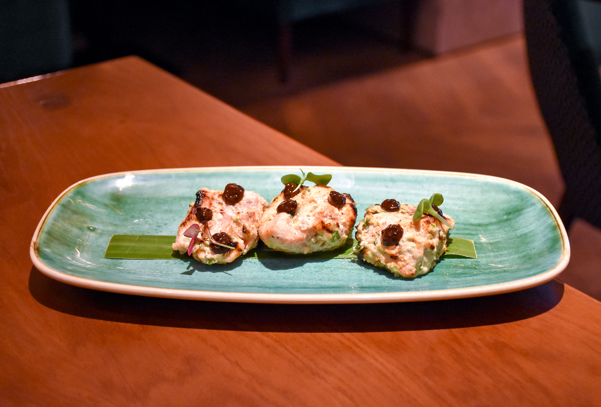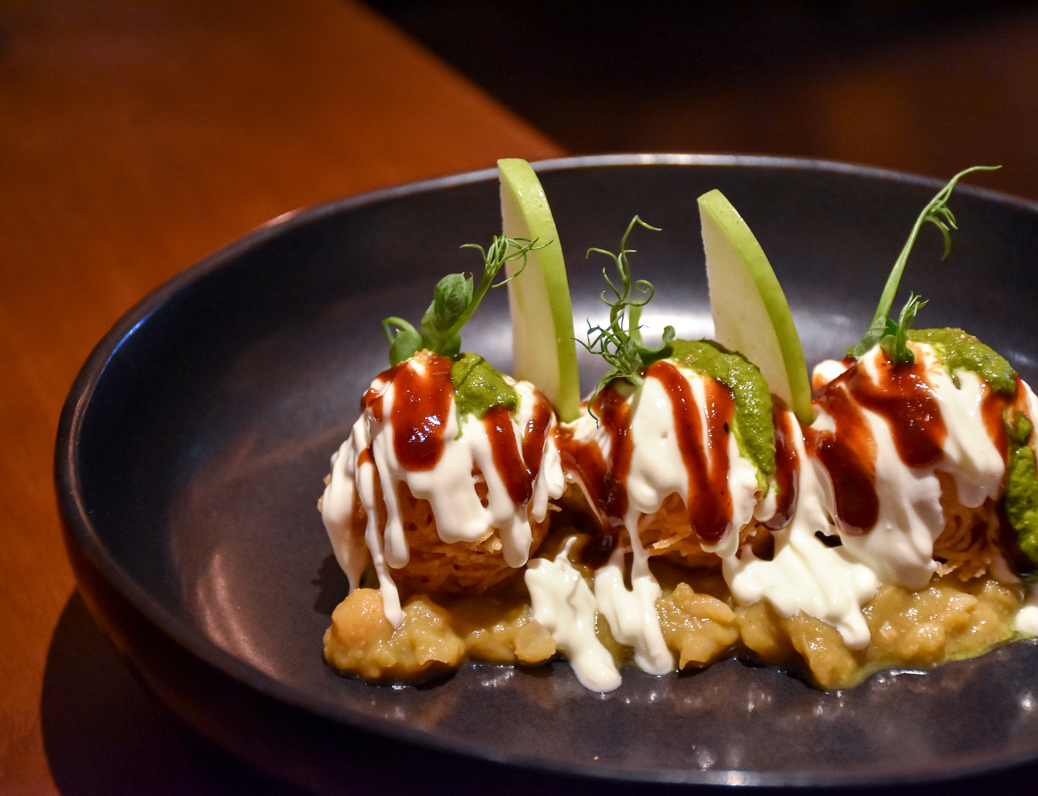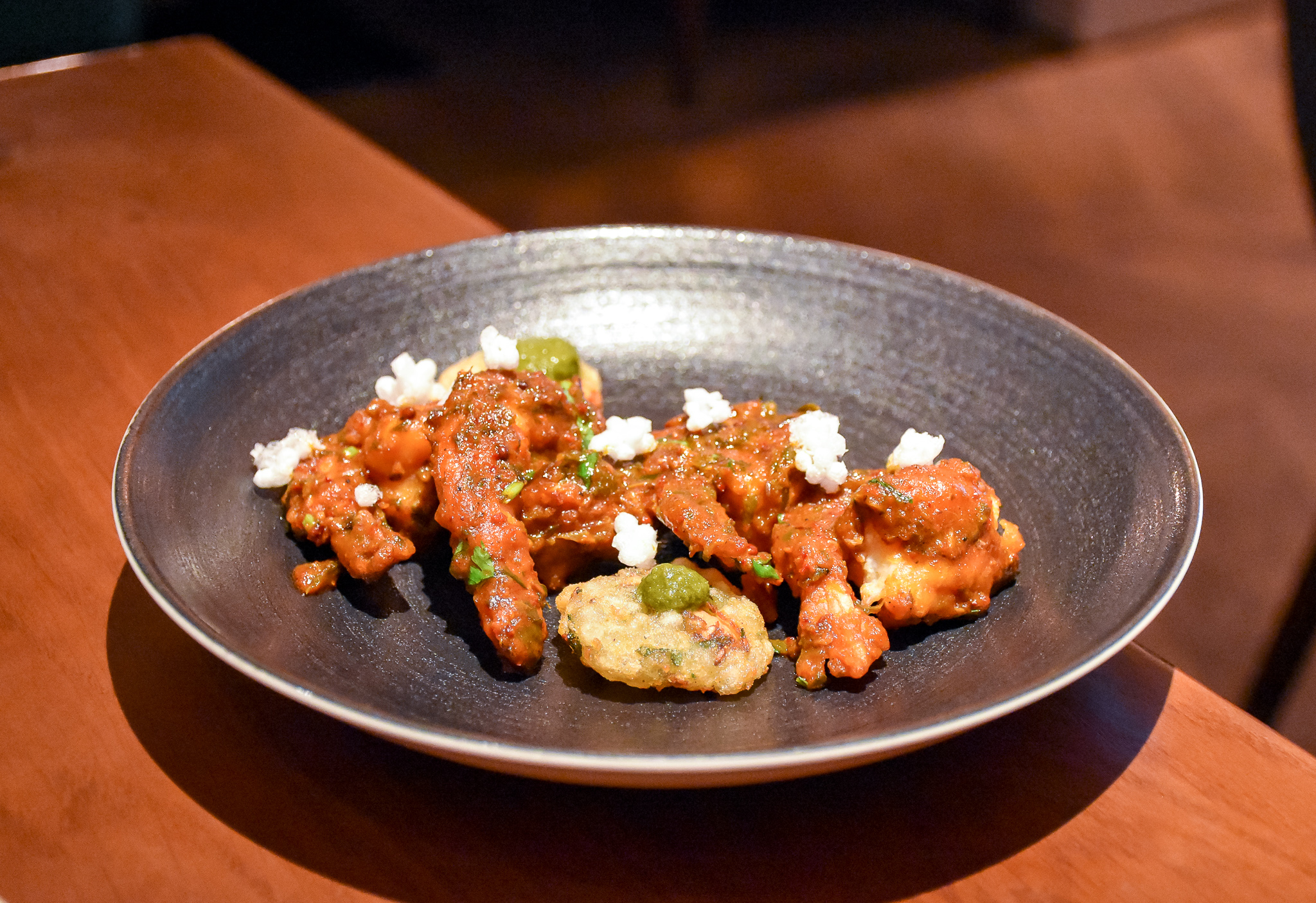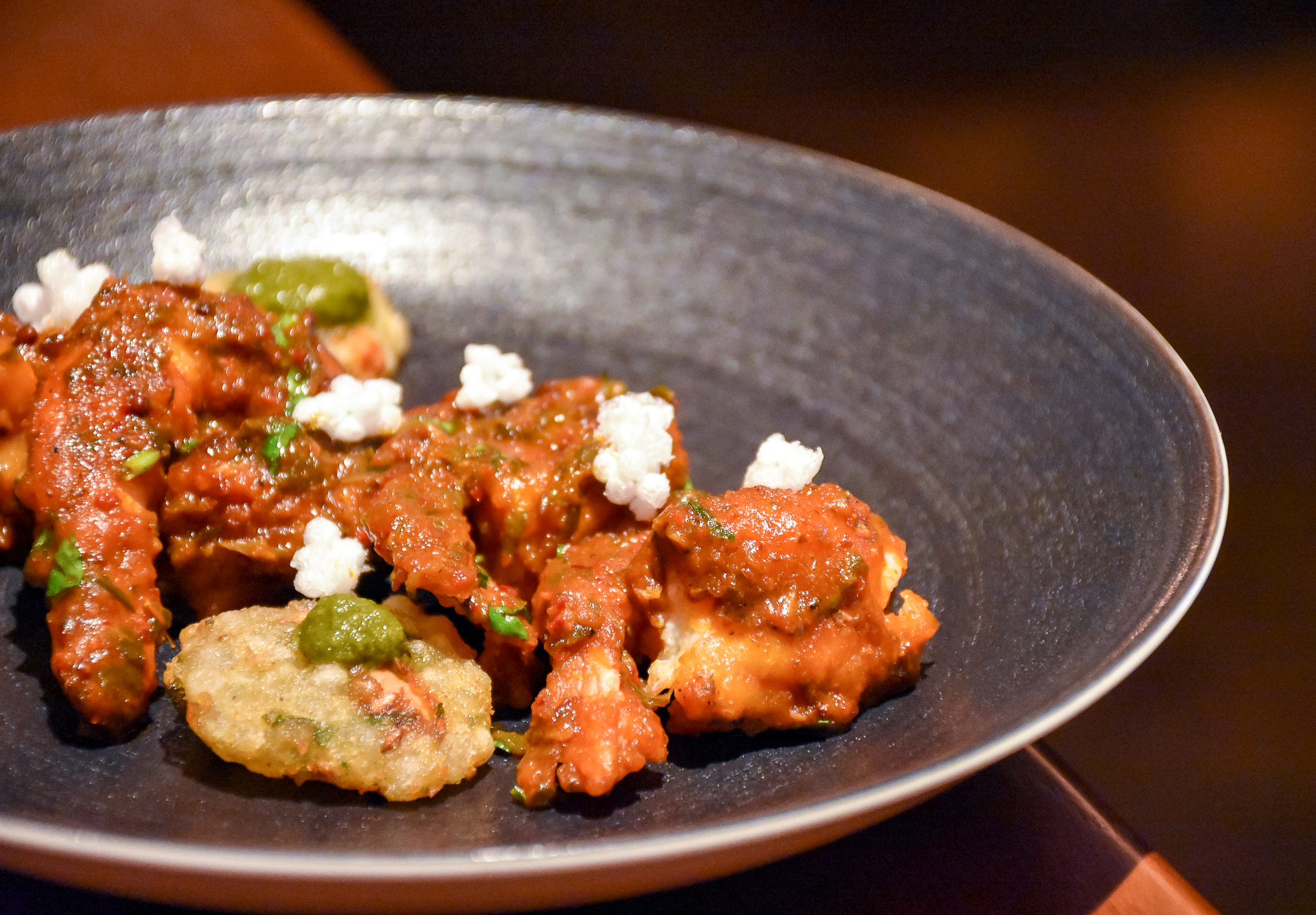 First of our dishes to arrive from the smaller plates option on the menu was the potato sphere chaat with white pea mash. The chaat was the right side of crispy, smothered in lashing of yoghurt, tamarind and coriander chutneys. It looked great and that unusual spicy pea mash really worked, adding yet another twist to this classic Indian staple.