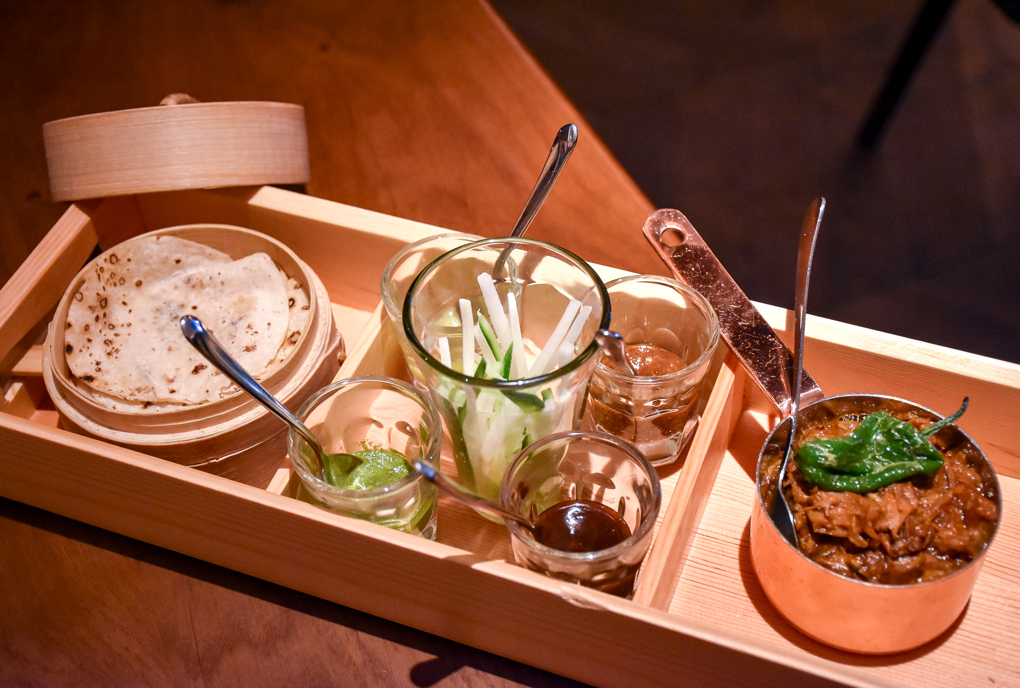 One of my favourite dishes was one I can only suspect is a signature of Indian Accent. Ghee roast lamb with roomali roti pancakes and a selection of chutneys. This was essentially an Indian version of the Chinese “crispy duck with pancakes” and I was blown away. The richness of that meat, the fluffy roti’s, spicy chutneys – it was such an explosion of flavour in the mouth. Price wise for the size it was completely out of sync in my opinion and needs to come by down a few pounds, but this dish is excellent and well worth trying.