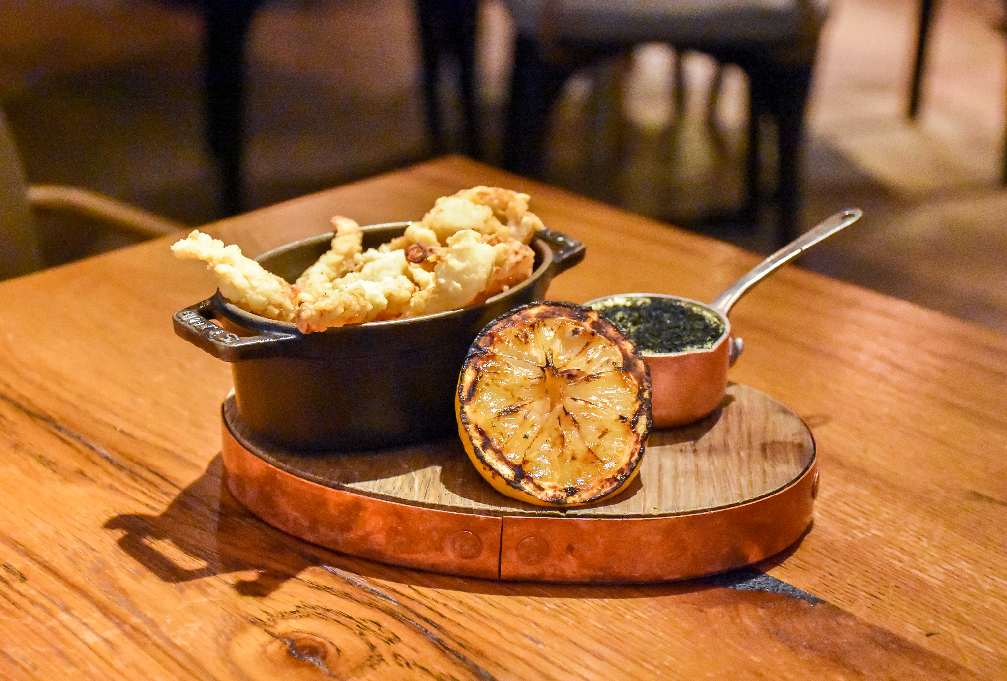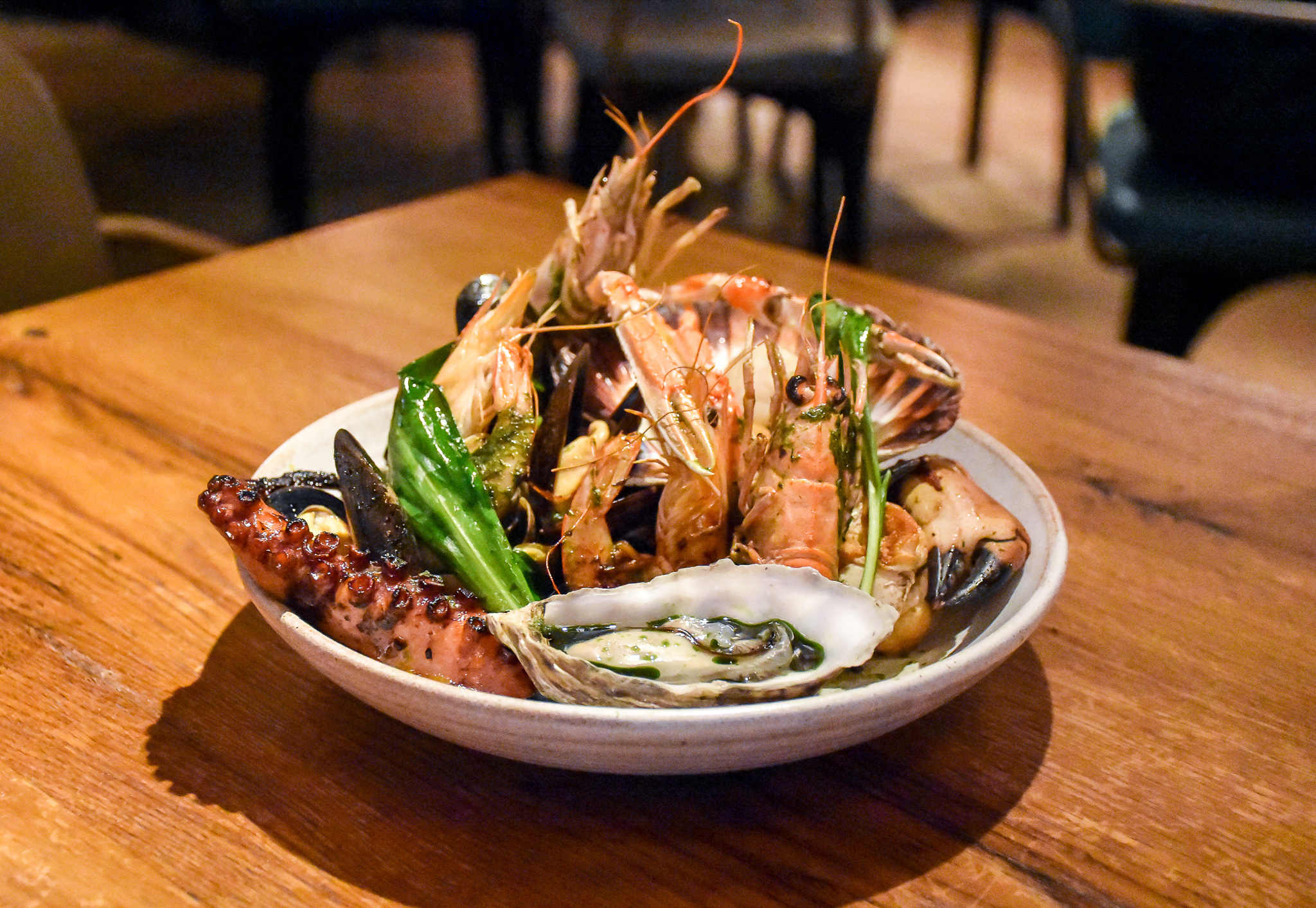 When it comes to pricing, you can really get quite a lot for your money here depending on what you order, particular note goes to the “surfboard”. Another huge offering, this time shellfish from the South Coast and Scotland – grilled over fire. All of the fish & shellfish is ethically caught, sustainable and delivered daily from the boats on the South Coast. We tucked into juicy mussels, succulent langoustines, charcoal grilled octopus tentacles, scallops and crab claws. Just to name a few. If that wasn’t already enough, the platter comes with a side of crispy golden coated quid with a whipped garlic dipping sauce. An overly generous dish, though I had no complaints.