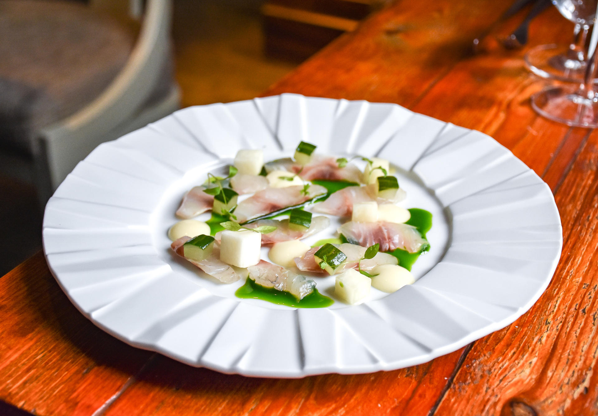 First dish out from the kitchen and one of my absolute favourites here was this beautiful, glossy cured seabass with lemon purée, cucumber, kohlrabi & parsley. It was so fresh, zesty, full of textures and it looked like a work of art on the plate with all that vivid parsley oil and creamy dollops of lemon purée.
