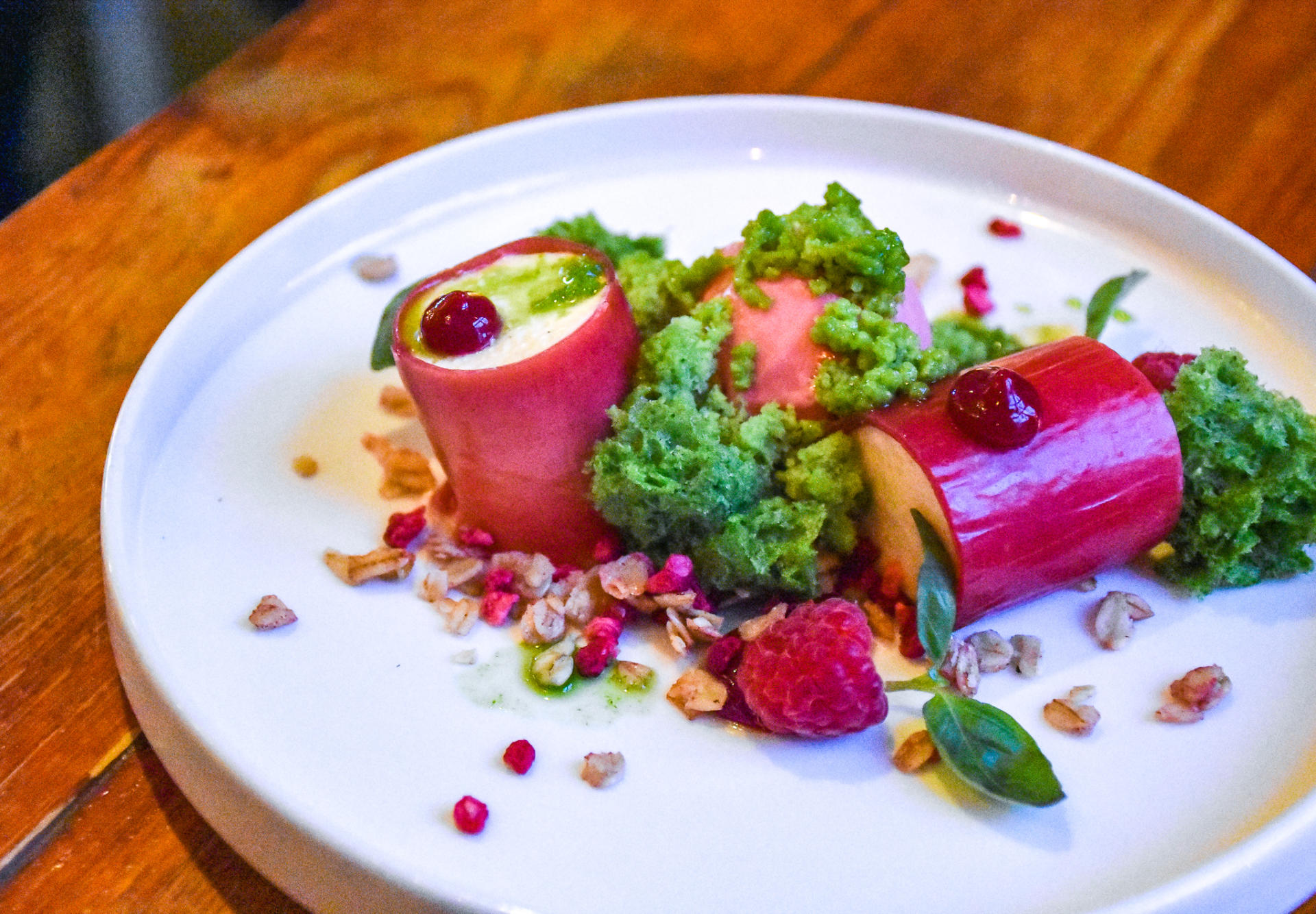 For dessert, we tucked into two. First was the lemon parfait with saffron ice cream, orange and rose which being mostly frozen – we tucked into quickly. A very nice dish, but for me there was just a touch too much citrus and sugar on the plate. Better and actually stunning was the cream cheese mousse with raspberry ice cream, basil and oats. Lots of textures, lots of colours and incredibly satisfying. The perfect way to end our meal.