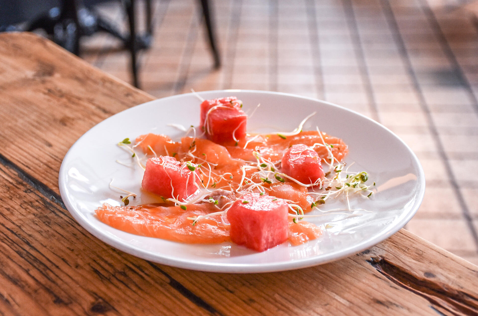 Another starter we indulged in was the home-cured salmon. Again, it was thoroughly enjoyable and looked like Summer on a plate. Served with pickled watermelon and radish sprouts, I highly recommend washing it down with a few too many glasses of wine or something sparkling. You’ll love it.