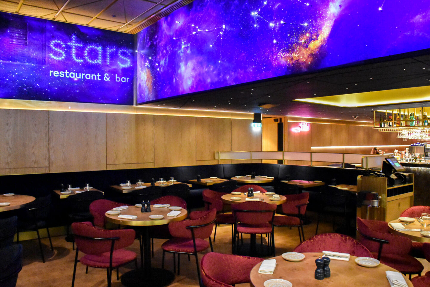 Stars is Soho’s newest restaurant and bar on the ground floor of the shiny new Soho Place Theatre. The first new theatre in the West End in 50 years, this is one place I’ve been excited to hear about and it certainly hasn’t disappointed. Outside its modern and glass-fronted, sparkling and reflecting the London evening lights. Inside, it’s modern and absolutely beautiful – with no expense spared (I’ve been told). The restaurant’s main feature and one which really makes me love this room so much, is the specially commissioned constellation artwork which moves and twinkles throughout, depicting constellation star signs and colorful galaxies and nebulas.